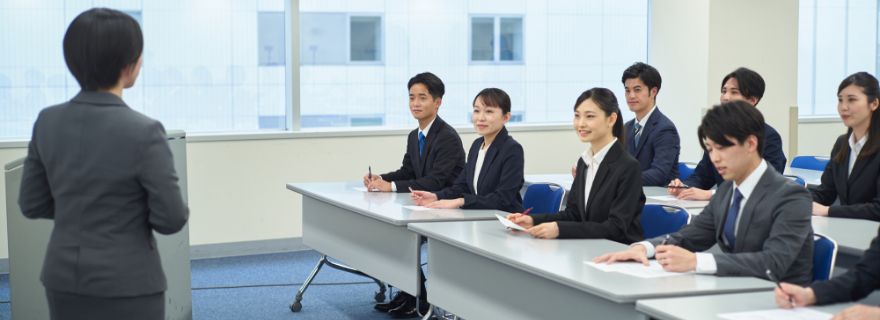 グループ会社の新入社員が合同で研修を行います。ビジネスマナーなど基礎的なことを身に付けることができます。