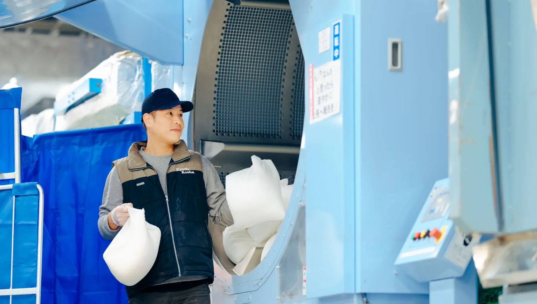 現在は、病院や施設で回収してきた衣類や布団類などを洗濯し、乾燥させて、仕上げの工程へ渡すまでの仕事を担当しています。